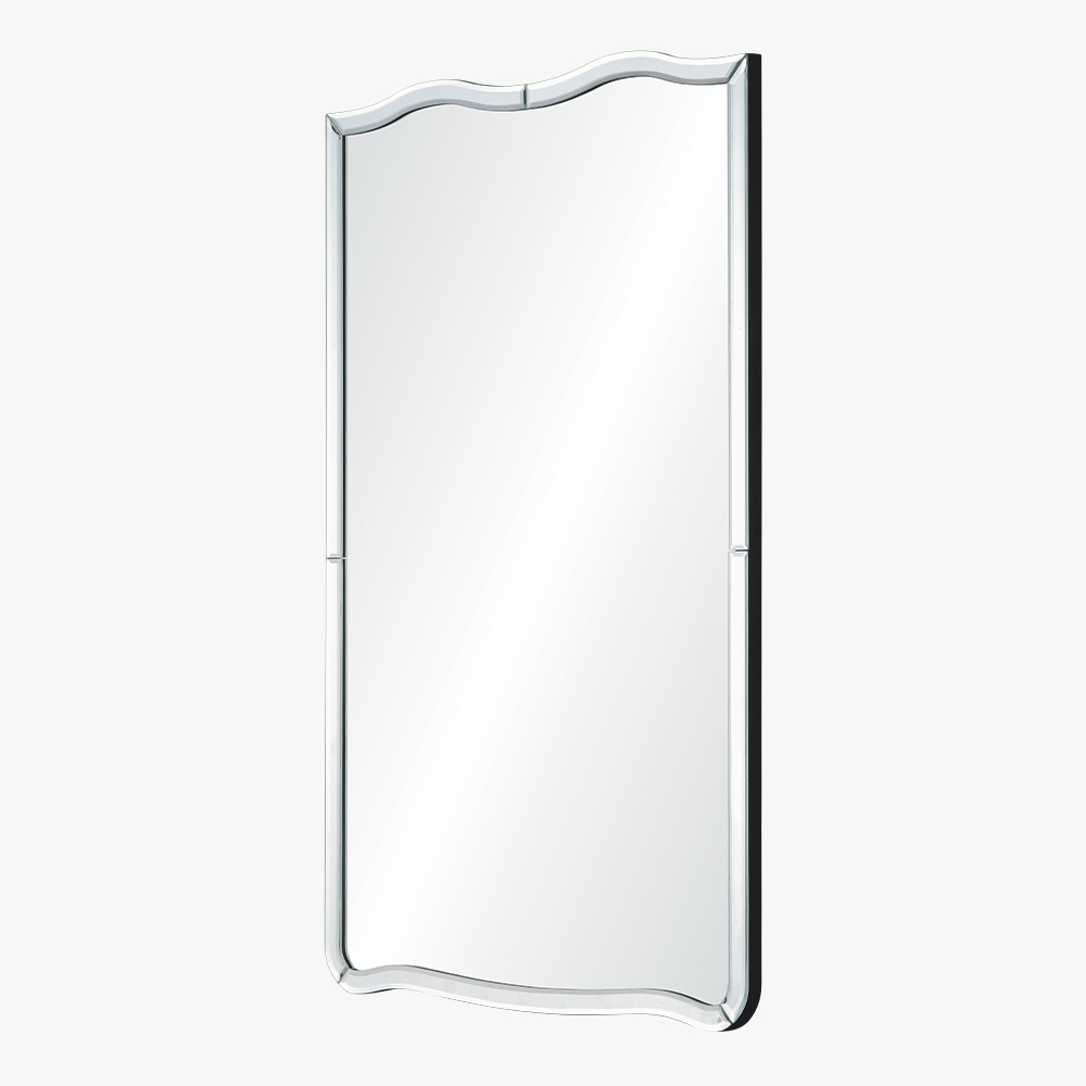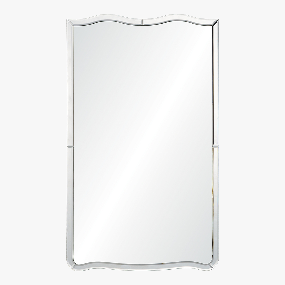Designed by Celerie Kemble. Hand cut mirror framed mirror. Non-beveled center mirror surrounded by hand cut and beveled mirror. Cleat hanging hardware provided.