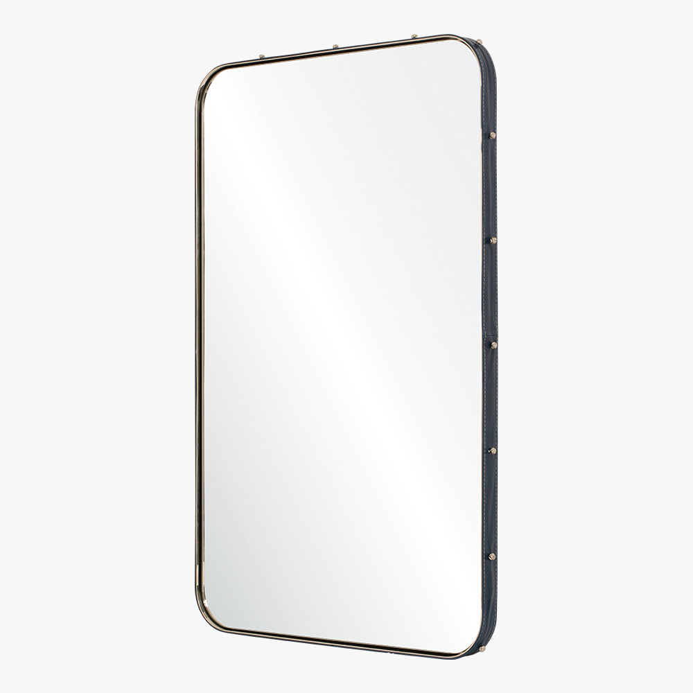 Navy leather wrapped stainless steel mirror with side rosette detail. Non-beveled center mirror. Cleat hanging hardware provided. Item can hang horizontally or vertically.